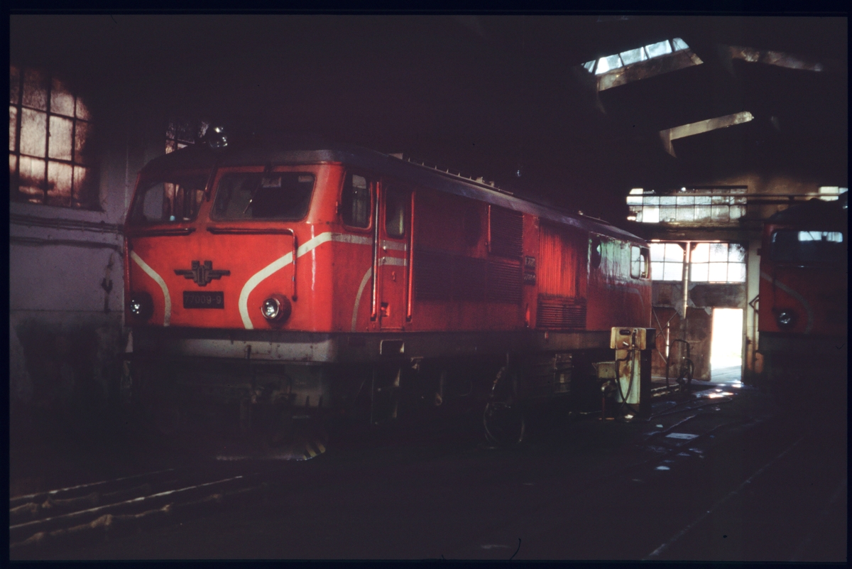Diesellok i stallet i Septemvri, Bulgarien. Loket har nummer 77 009-9.