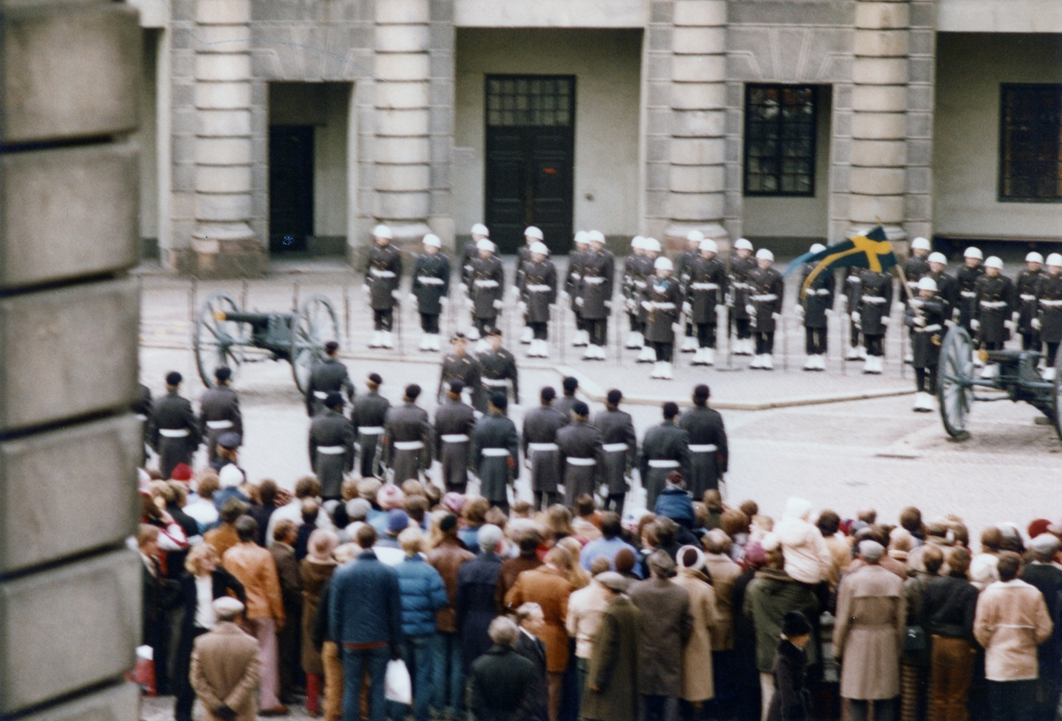 Pågående vaktchef har kommenderat: "Befäl och förste män - marsch!" varvid första avlösningens poster marscherar till plats utanför kanonerna.