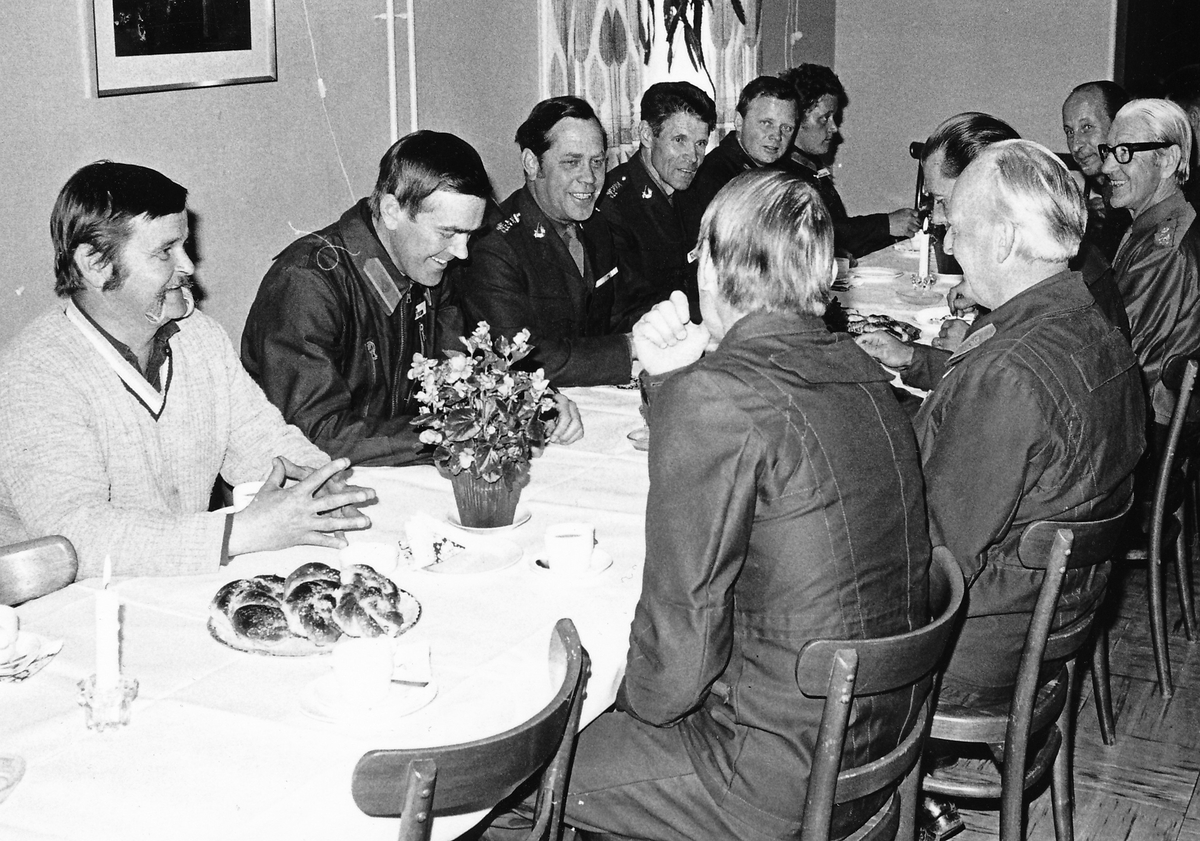 Fr.v. på bordets bortsida; Förrådsman Lars-Erik Ohlsson, kn Yngve Pettersson, övlt Björn Bernroth, kn Karl-Åke Bergström, fj Stig Gustavsson och fj Ulf Larsson.