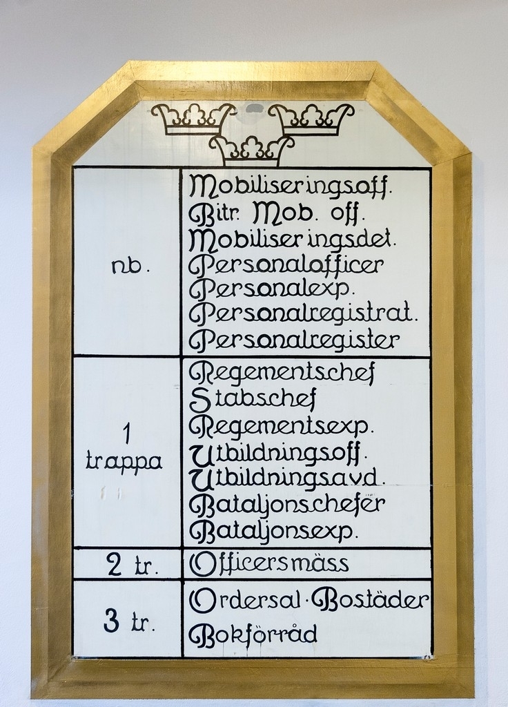Ålder på infotavlan är osäker, kansker från 1920-talet. Men den är säkert målad före 60-talet då bataljonscheferna flyttade till andra byggnader.