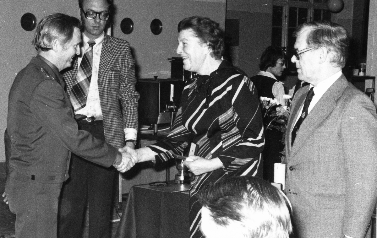 Öv 1. Åke Eriksson delar ut medaljer till några pensionsavgångna trotjänare.