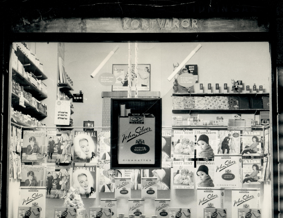 Reklam för John Silver-cigaretter i Roland Gustavssons tobakshandel i Nyköping.