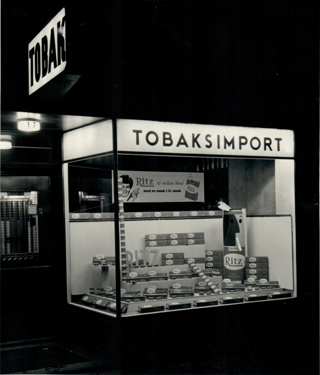Skyltfönster i en tobakshandel med reklam för Ritz-cigaretter.