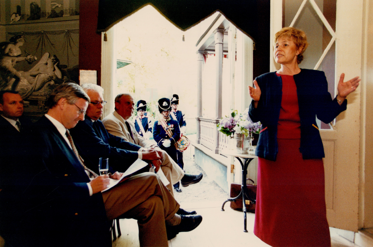 Museichef Inga Junhem håller tal vid Tobaks- och Tändsticksmuseums invigning år 2000.