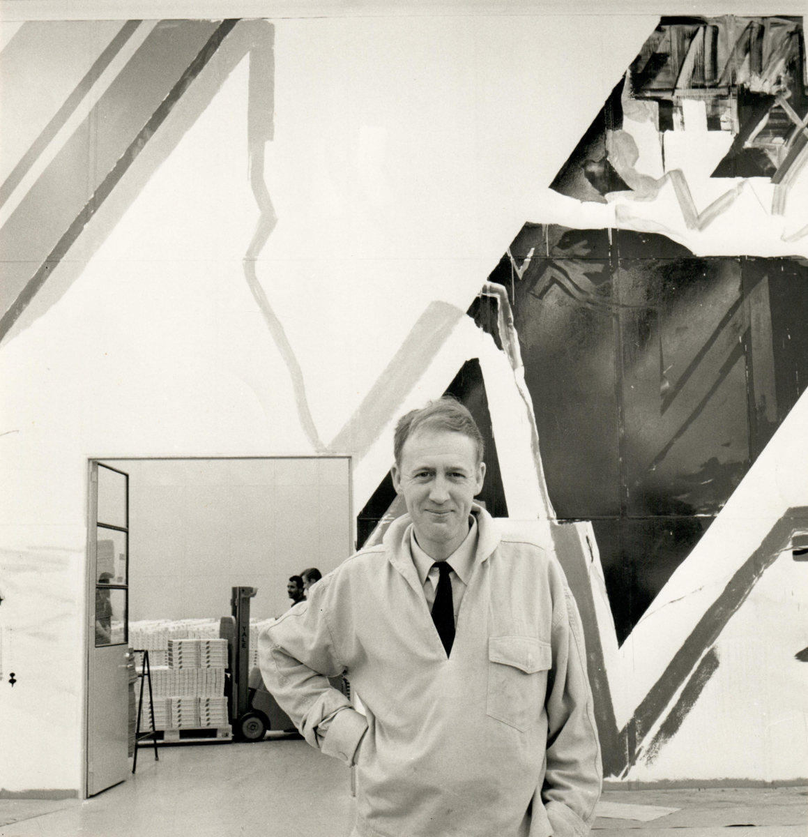 Jörgen Fogelquist står framför sin väggmålning i Frans Suell-tobaksfabriken i Malmö 1967.
