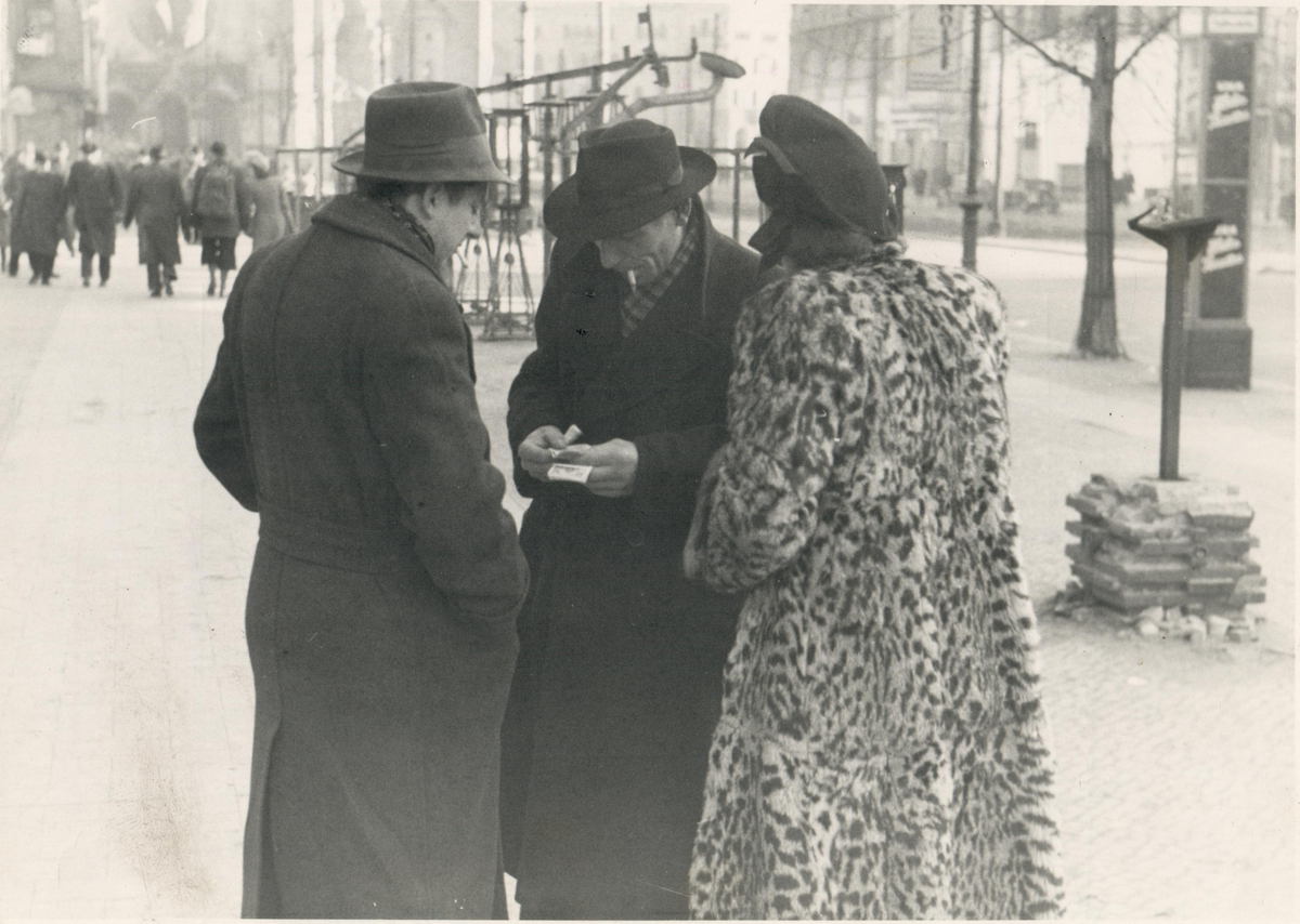 Svartmarknadshandlare vid Kürfurstendamm säljer cigaretter nära zoot.