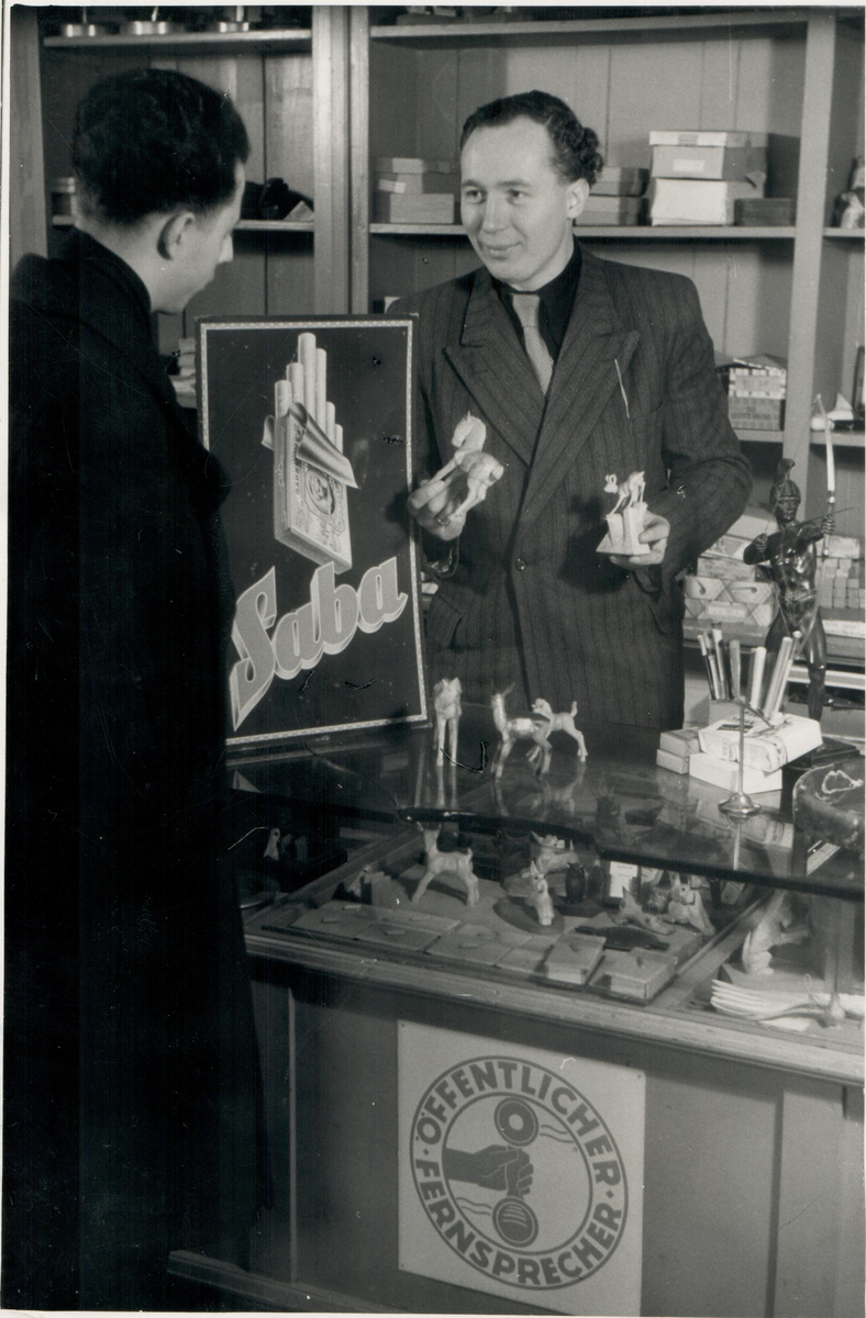 En cigarrhandlare i en tobakshandel i Berlin. Utöver tobaksprodukter säljer han även konstföremål.