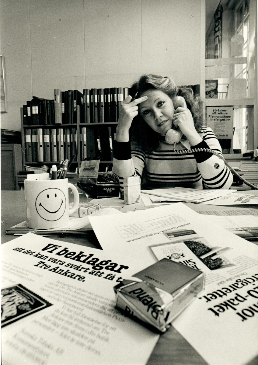 En kvinna i ett telefonsamtal under en cigarettkampanj.