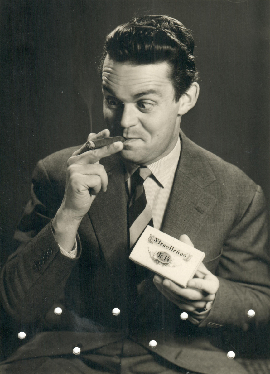 Den danske kompositören Svend Assmusen röker en cigarr från cigarrmärket Brasilienos.