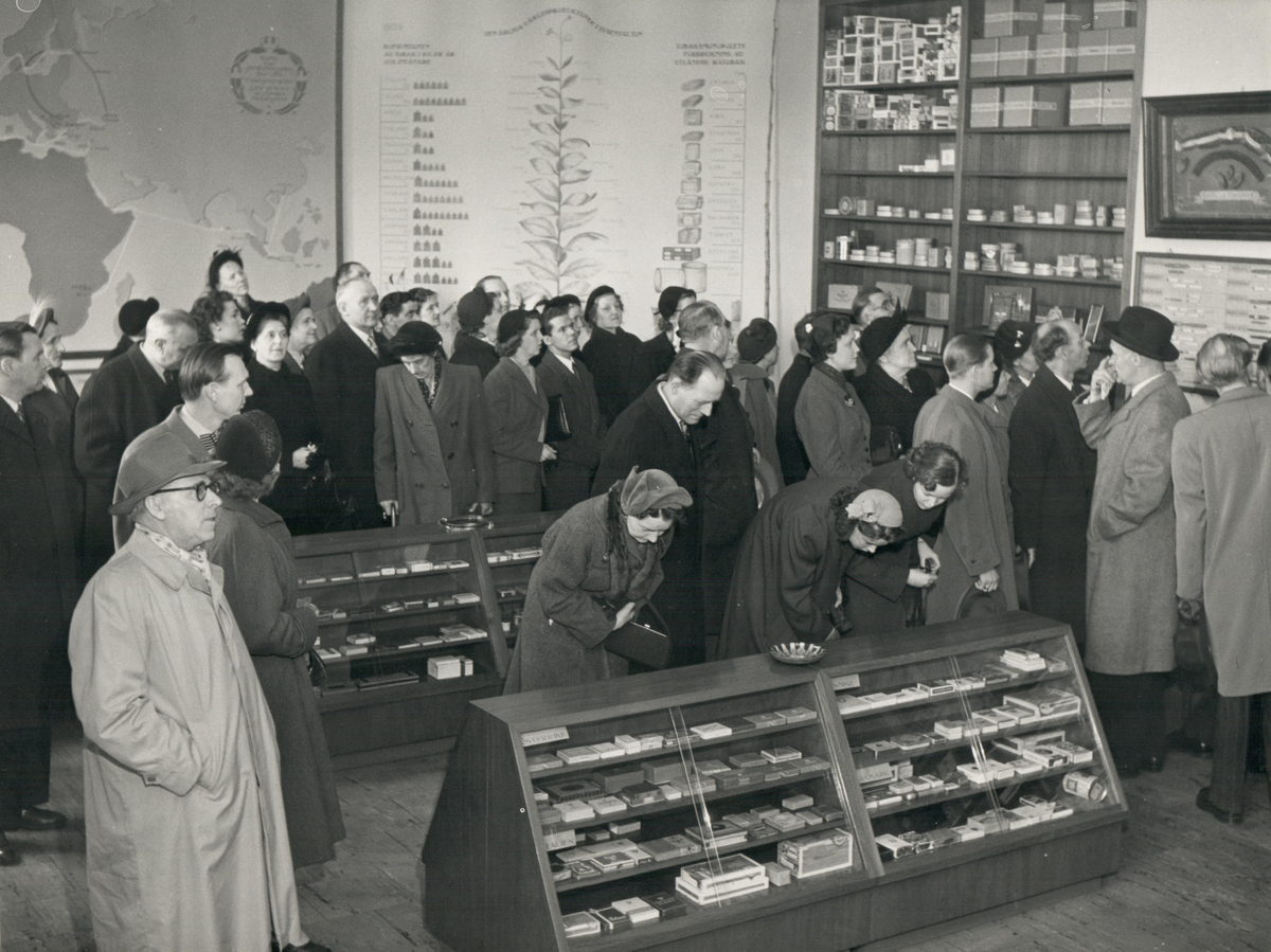 Museibesökare vid Svenska Tobaksmonopolets museum.