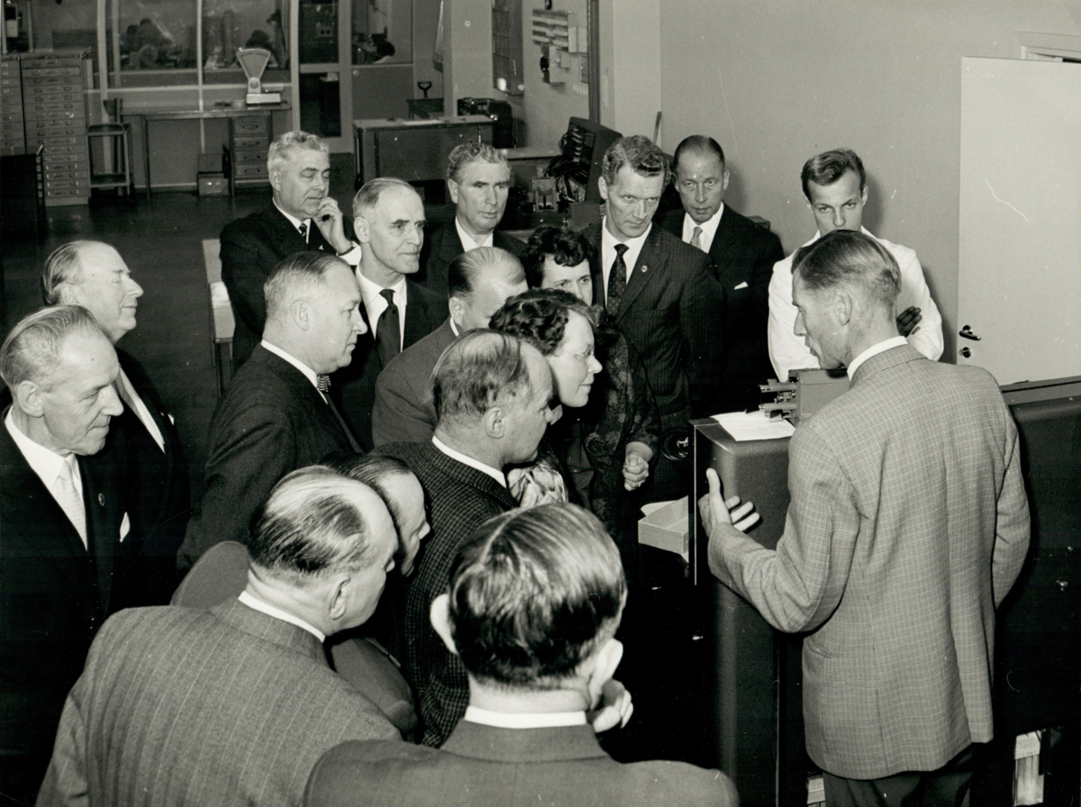 Visningen av Pressbyråns nya fastighet fredagen den 7:e oktober 1960. Kamrer Ola Pärson redogjorde för hålkortsavdelningens organisation och de många invecklade maskinerna.