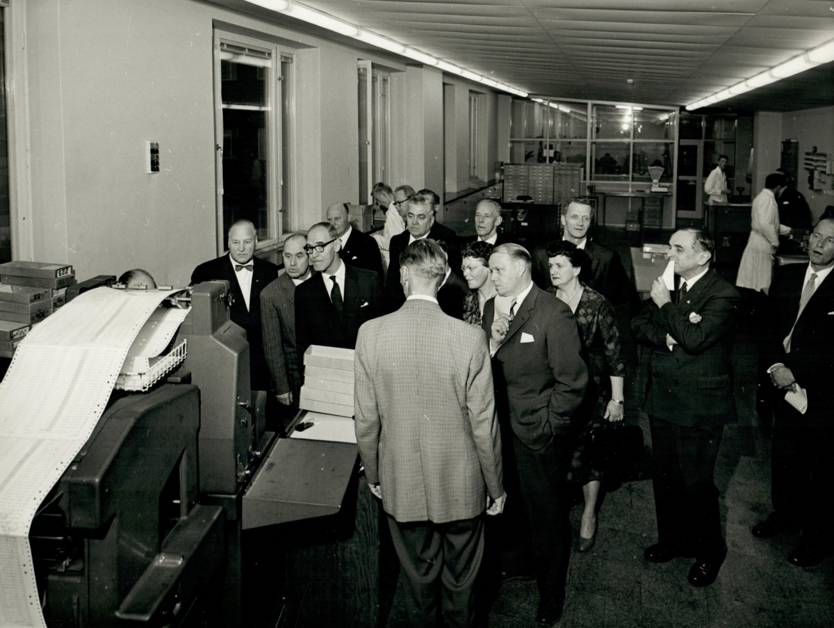 Visningen av Pressbyråns nya fastighet fredagen den 7:e oktober 1960. Kamrer Ola Pärson redogjorde för hålkortsavdelningens organisation och de många invecklade maskinerna.