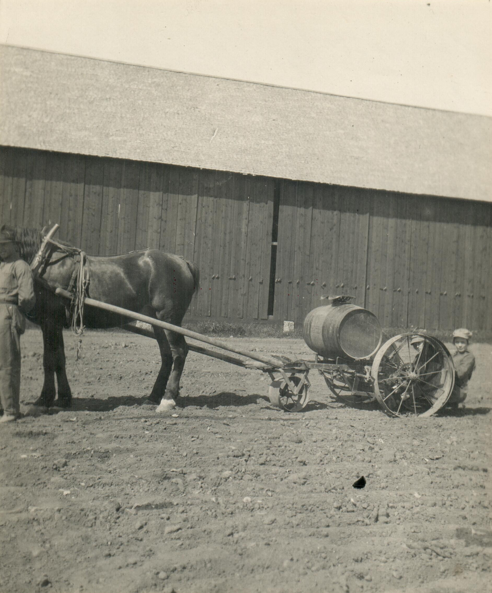 Den amerikanska planeringsmaskinen "Transplanter" dras av en häst på tobaksfältet.