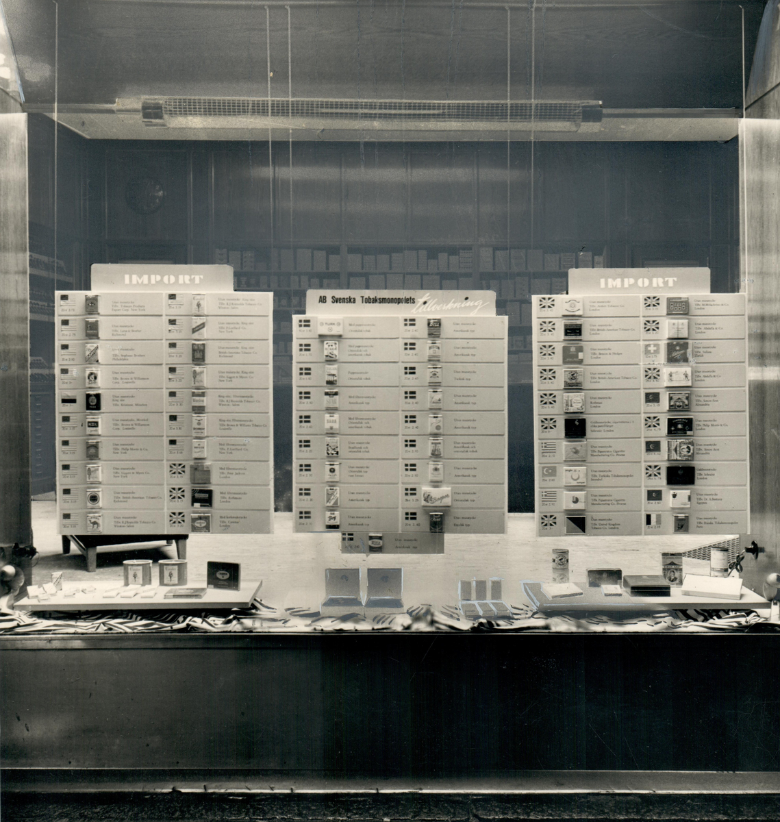 Skyltfönster som visar Svenska Tobaksmonopolets importerade, likväl som svensktillverkade, cigarettmärken.