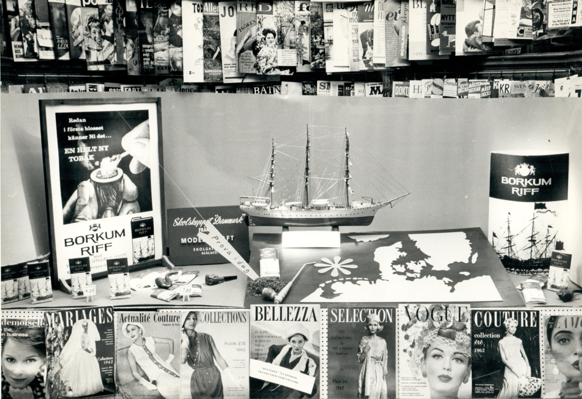 Skyltfönster i Gunnar Jacobssons tobakshandel med reklam för röktobak från Borkum Riff. Klostergatan 12, Lund.