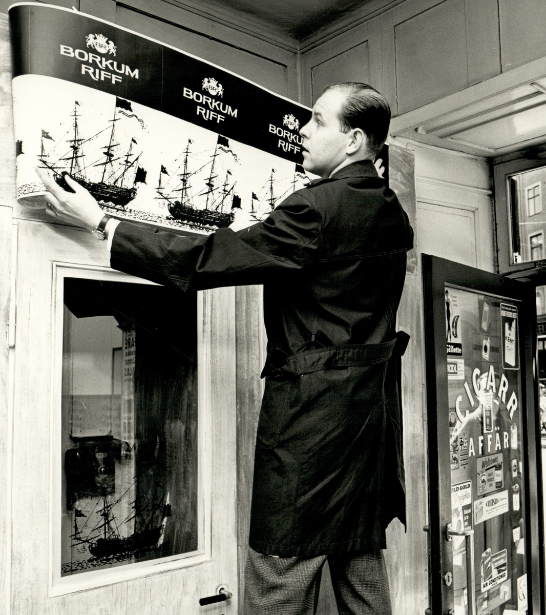 Reklam för Borkum Riff sätts upp utanför en cigarraffär.