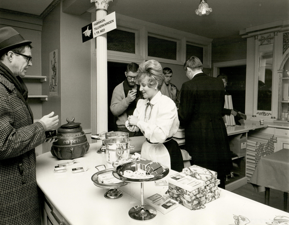 Titel: Tobaksmuseets personal betjänar kunder i Gubbhyllan.