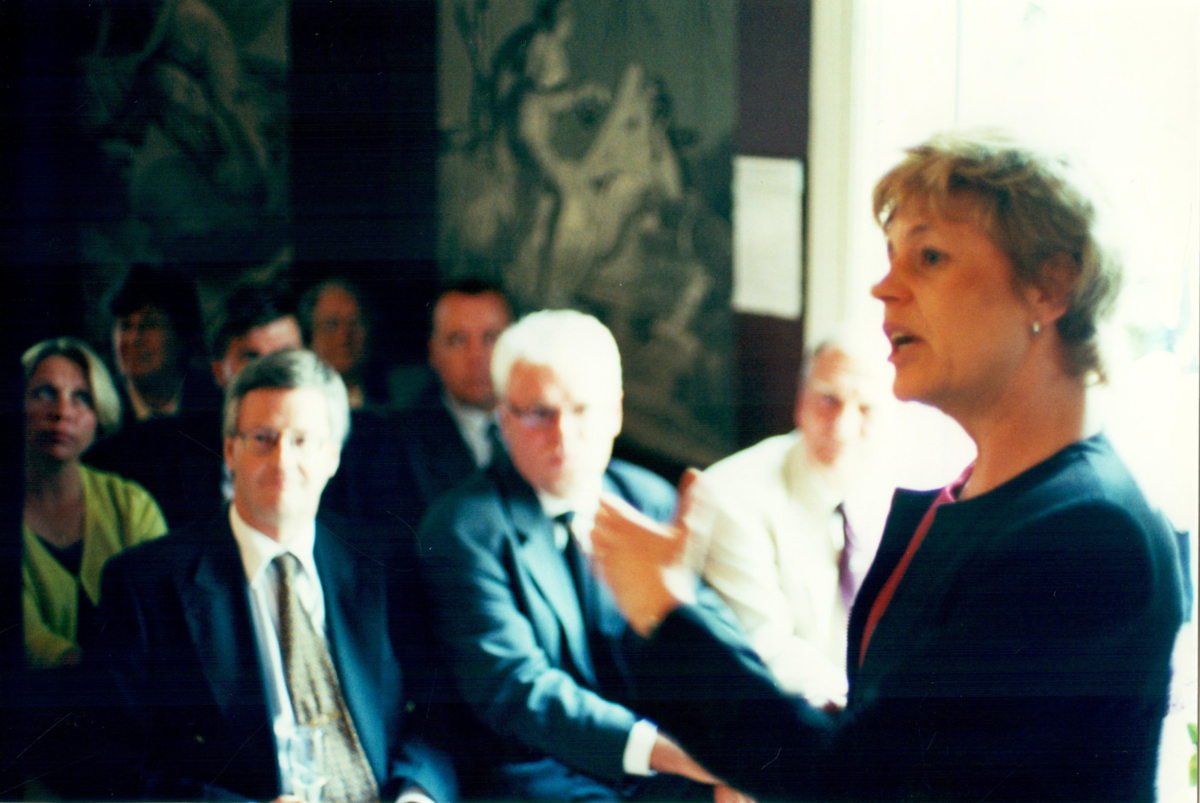 Museichef Inga Junhem håller tal vid Tobaks- och Tändsticksmuseums invigning år 2000.