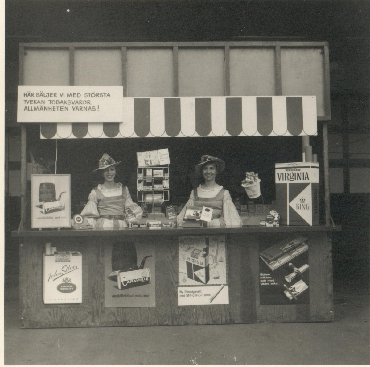 Tobakshandeln. Handlare i butiken. Tobaksvaror säljes vid stånd.