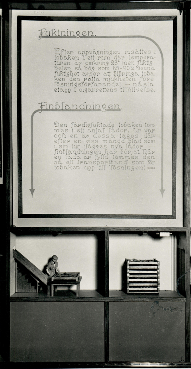 Monter med beskrivning av Svenska Tobaksmonopolets produktionsflöde.
