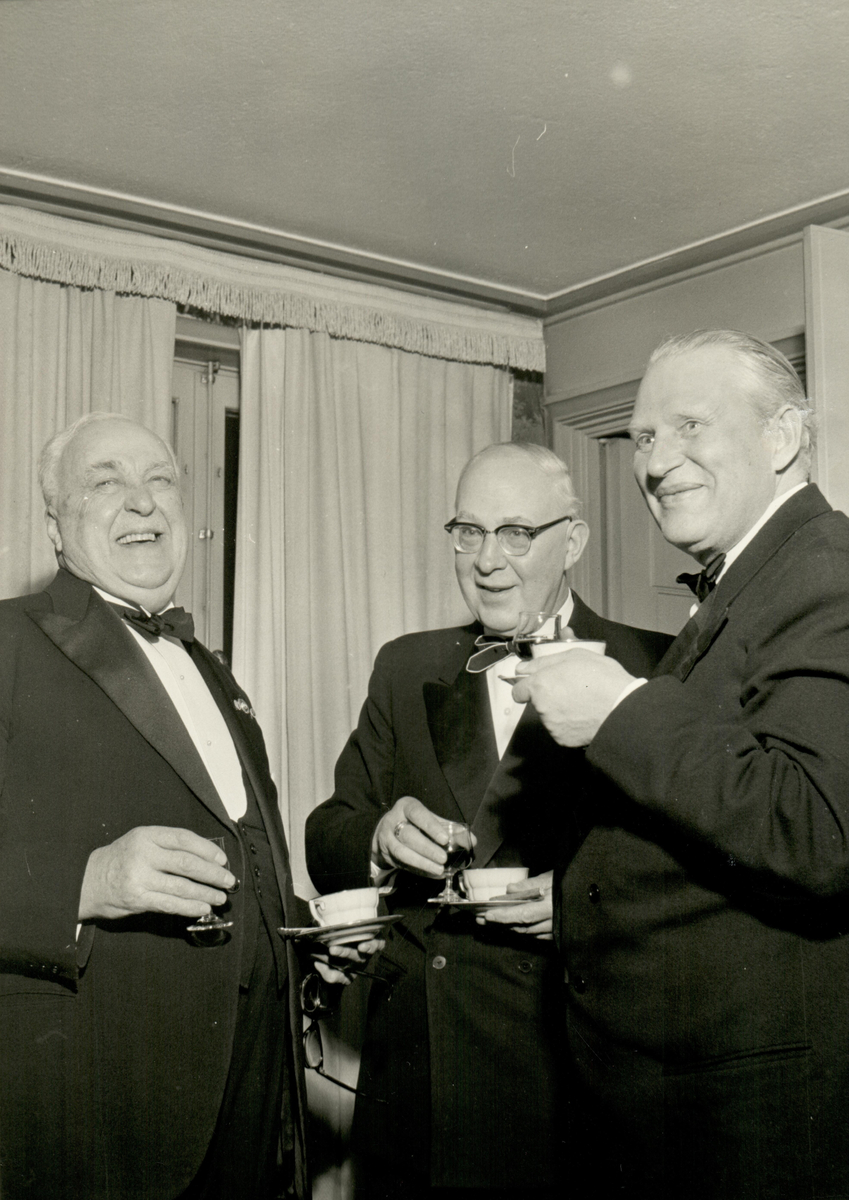 Tre män klädda för festligare tillställning. Samtliga håller kaffekopp på fat.