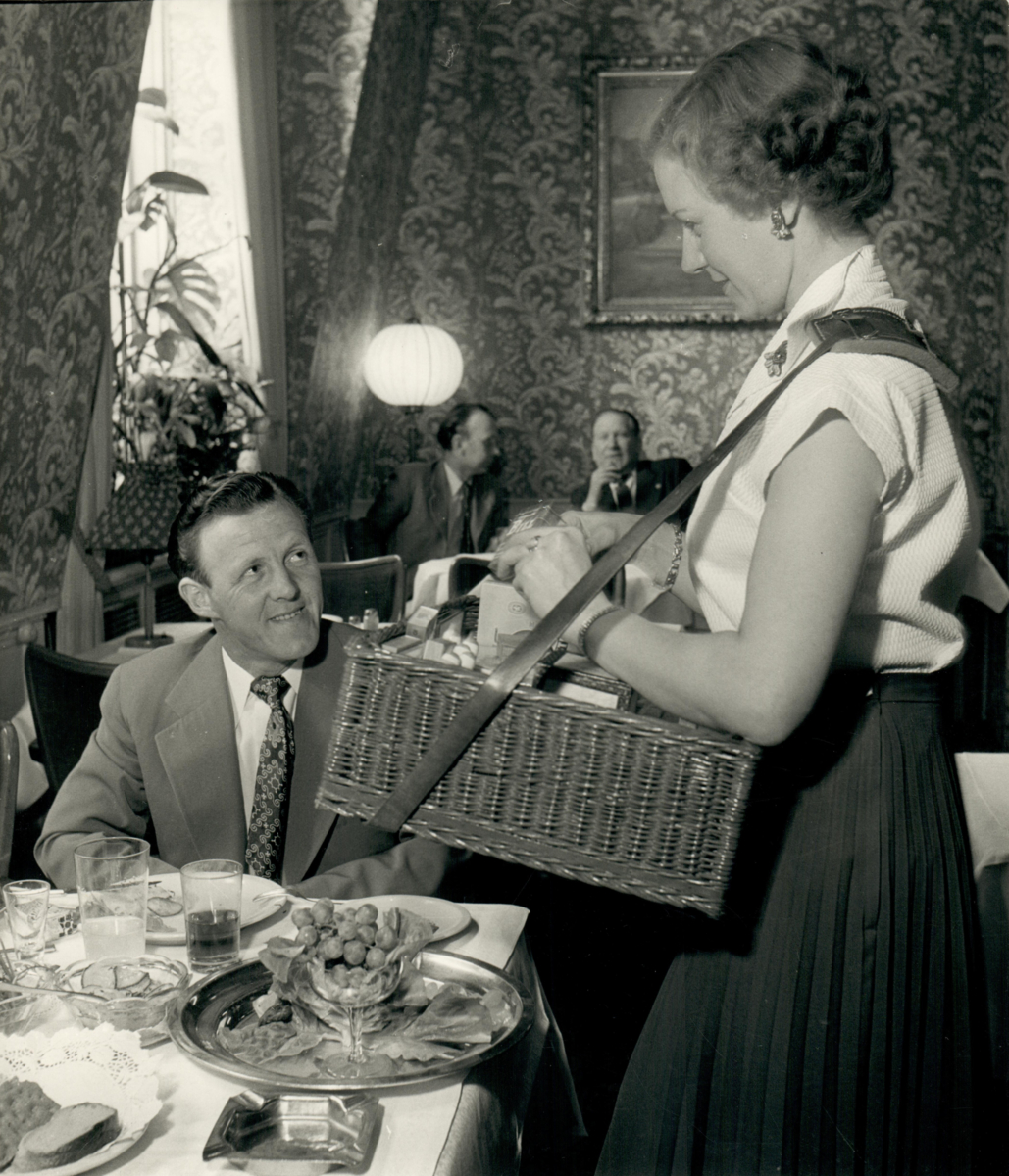 Kvinna med låda på magen delar ut Bill-cigaretter.