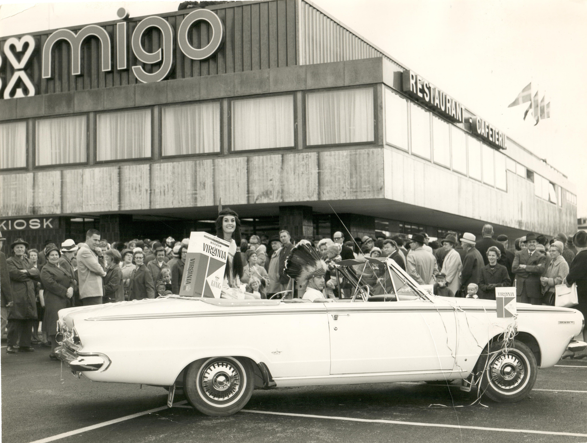 Kampanj för Virginia King-cigaretter, intill varuhuset Migo.