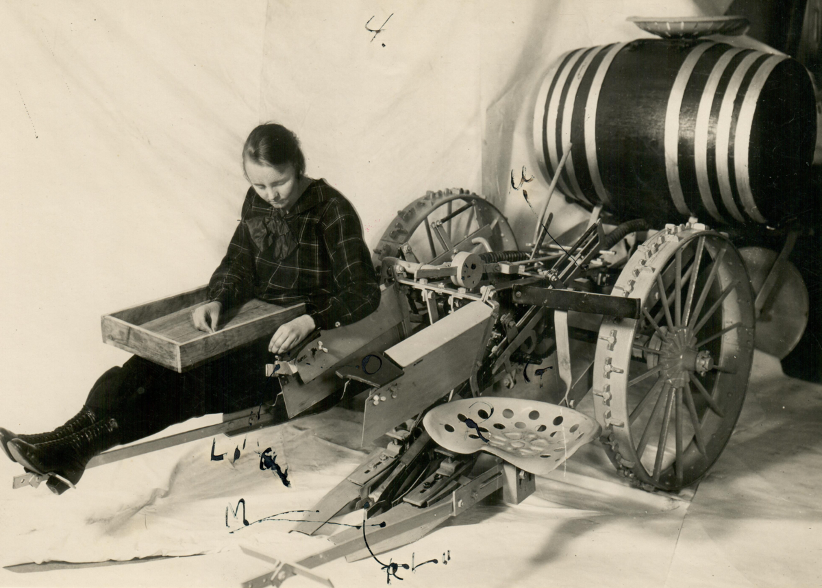 En kvinna sitter på den amerikanska planteringsmaskinen "Transplanter".