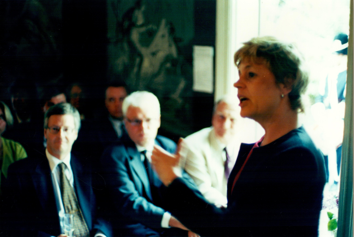Museichef Inga Junhem håller tal vid Tobaks- och Tändsticksmuseums invigning år 2000.