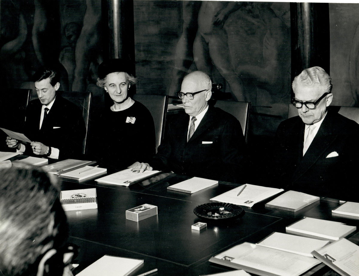 Tre män och en kvinna sittandes vid ett bord, signerandes pepper under ett styrelsemöte.