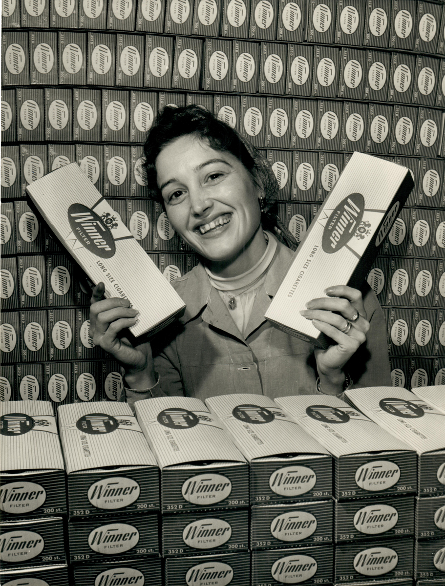 En kvinna håller upp cigarettlimpor av märket Winner.