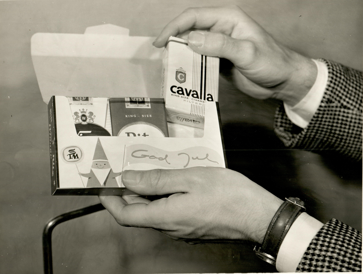 Tre cigarettpaket läggs in i en julförpackning.