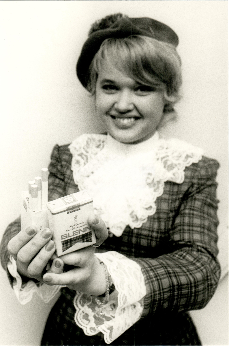 En kvinna håller upp ett cigarettpaket från Glenn, reklambild.