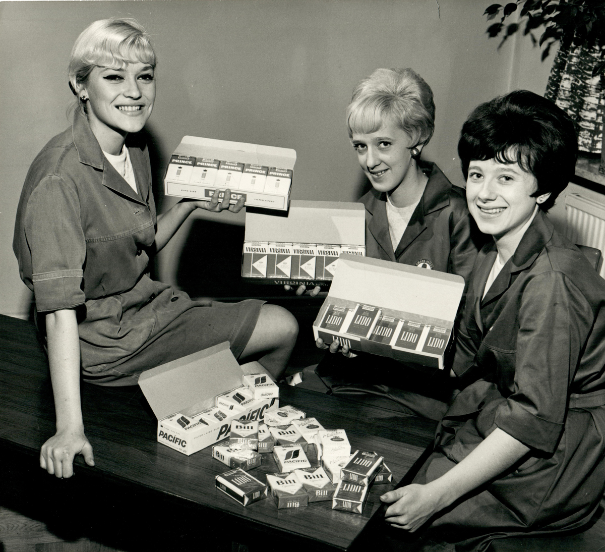 Personal vid Frans Suell tobaksfabrik visar upp diverse cigarettpaket.