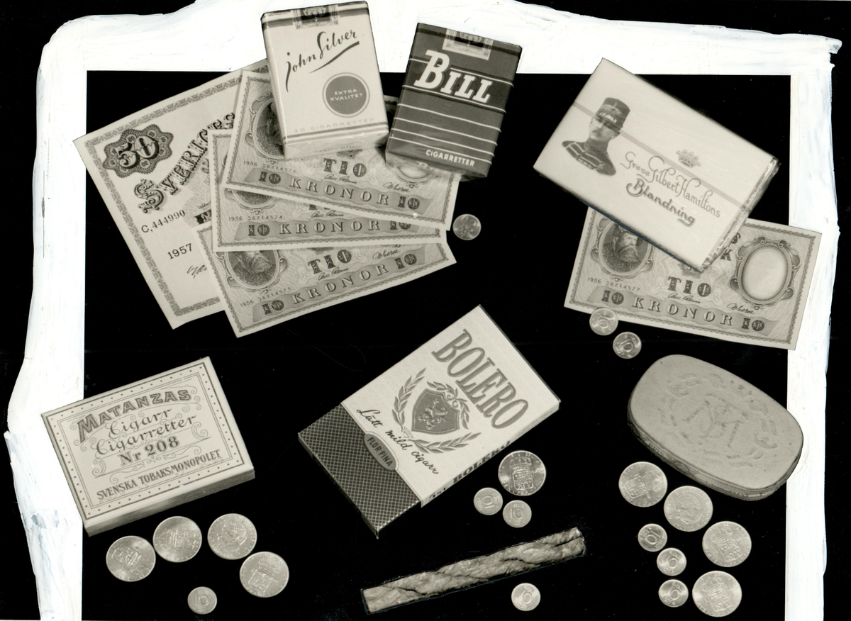 Sedlar och mynt från 1950-talet visas upp tillsammans med diverse tobaksprodukter.