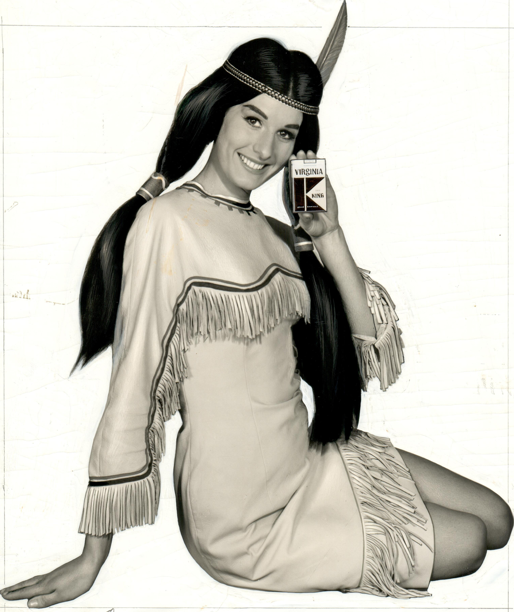 En kvinna håller upp ett cigarettpaket av märket Virginia i en reklambild.