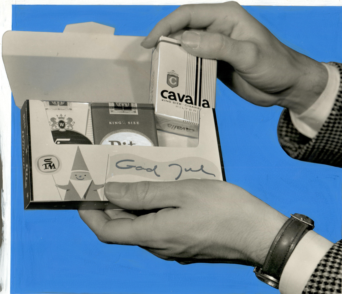 Cigarettförpackningar packas ner i ett paket med julhälsningar på.