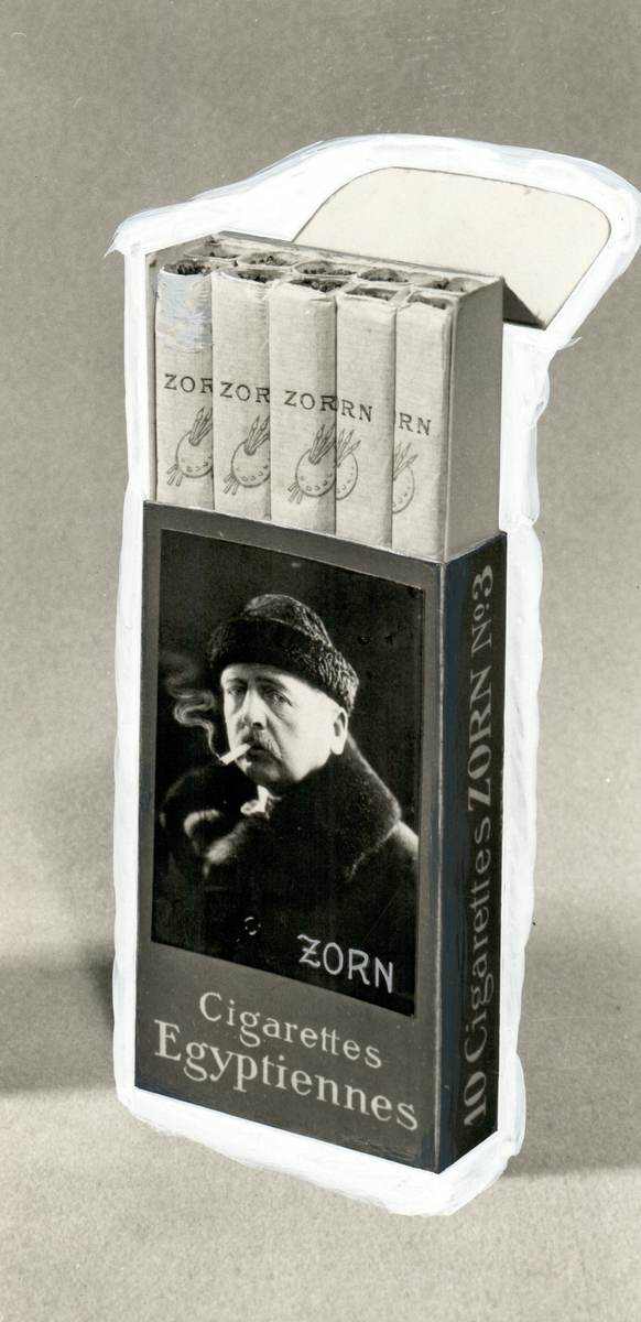 Cigarettförpackning av egyptisk typ som tillverkades för Anders Zorns privata bruk.