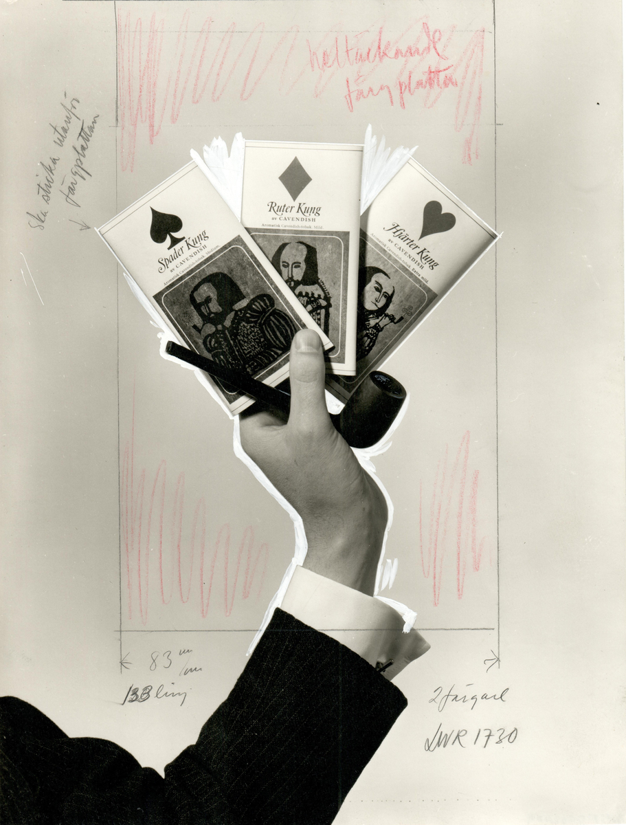 Reklam för röktobak av sorterna Spader-, Ruter- och Hjärter Kung.