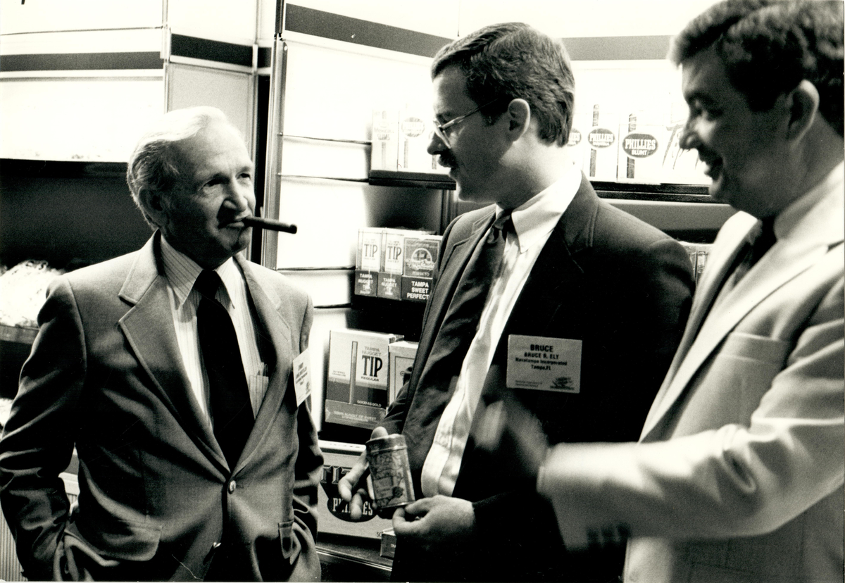 Tre män konverserar på en cigarrmässa.