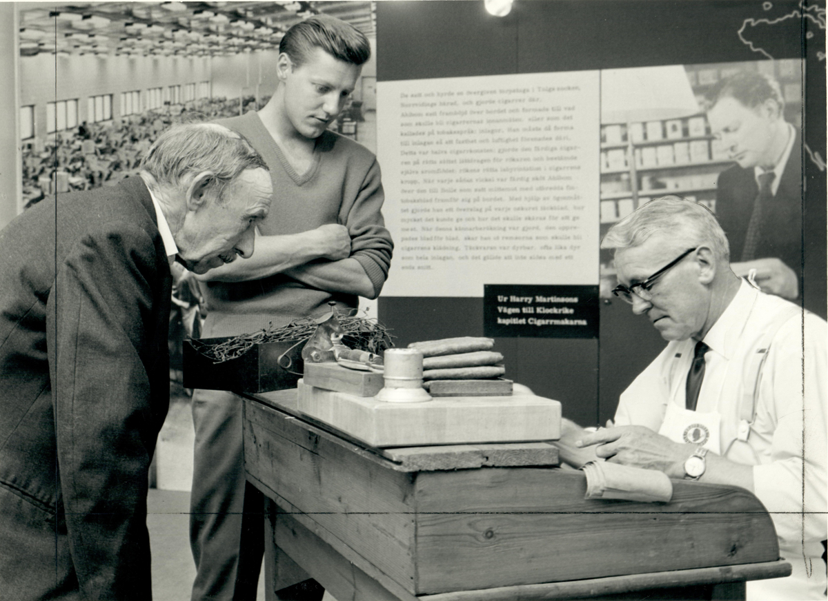 En anställd vid Frans Suell tobaksfabrik visar hur en cigarr tillverkas vid en tobaksutställning.