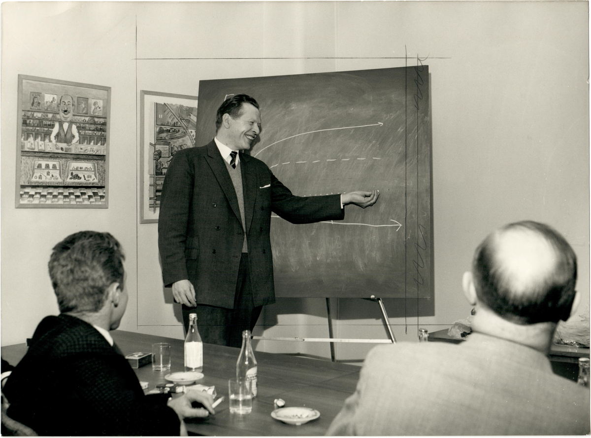 En man ritar på en griffeltavla på ett marknadsföringsmöte.