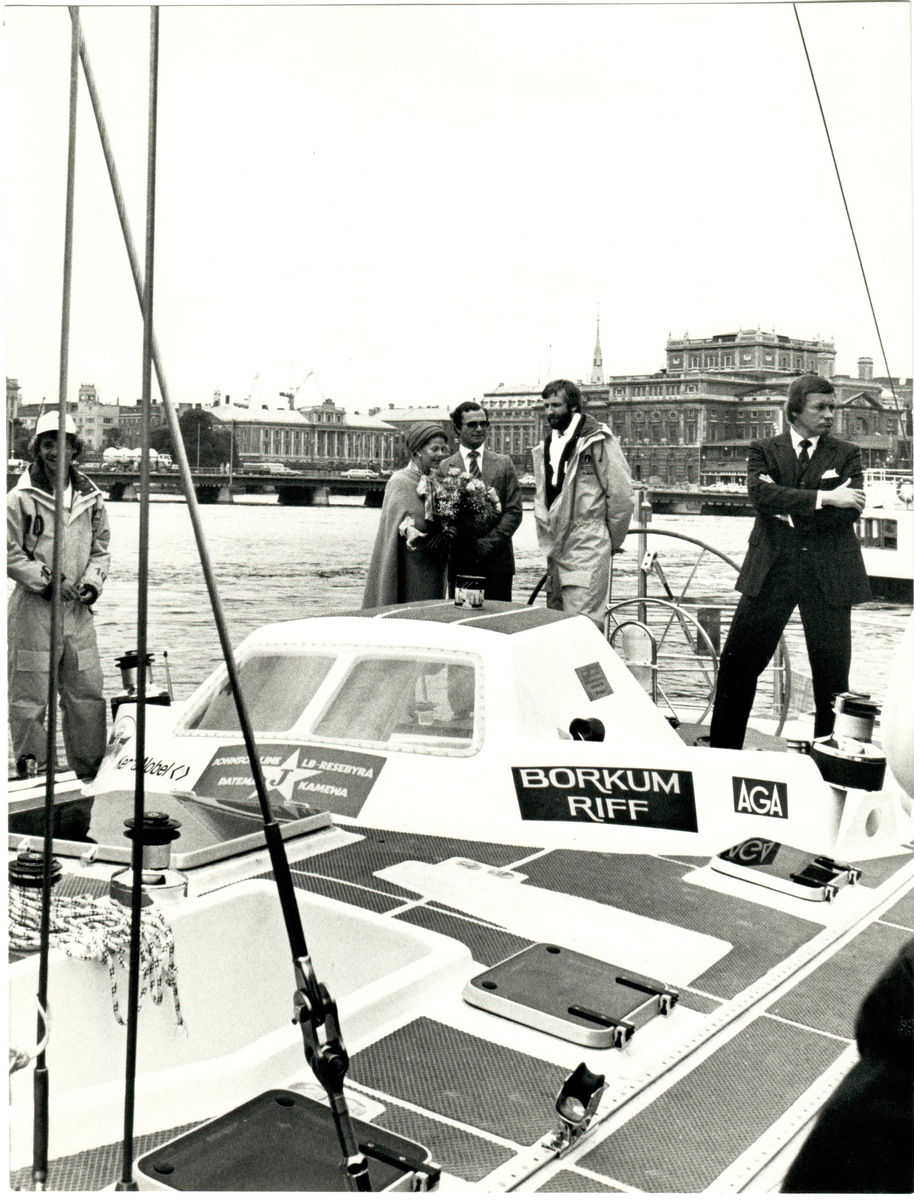 Kungen och drottningen ombord på segelbåten "Swedish entry" 1984. Reklam för piptobak från Borkum Riff på båten.