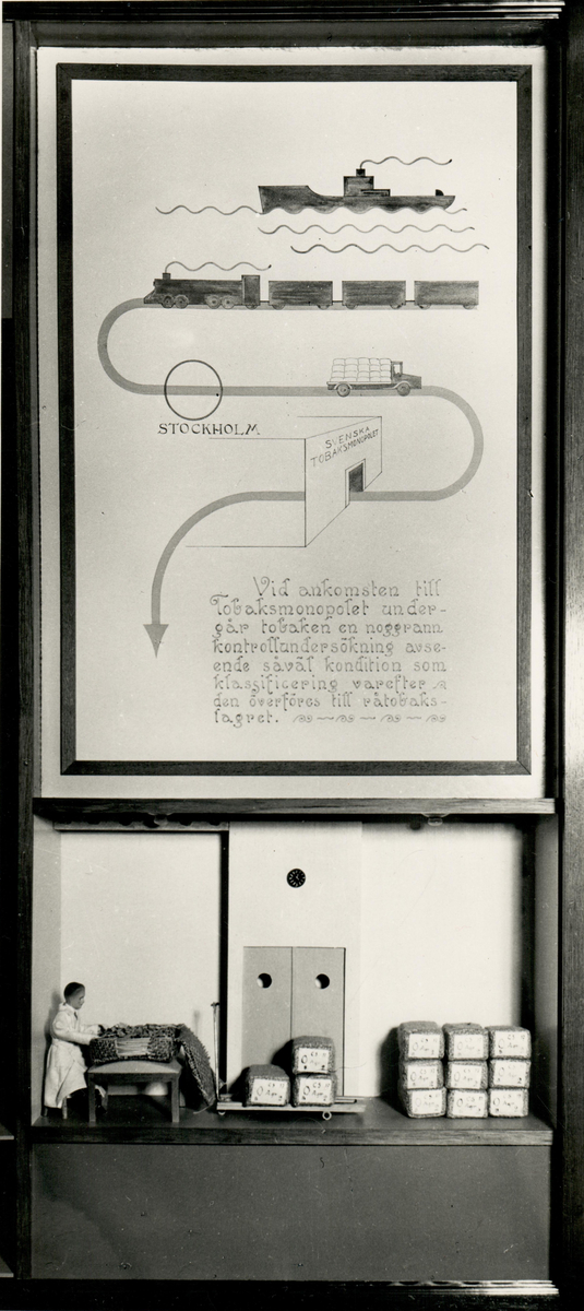 Monter med beskrivning av Svenska Tobaksmonopolets produktionsflöde.