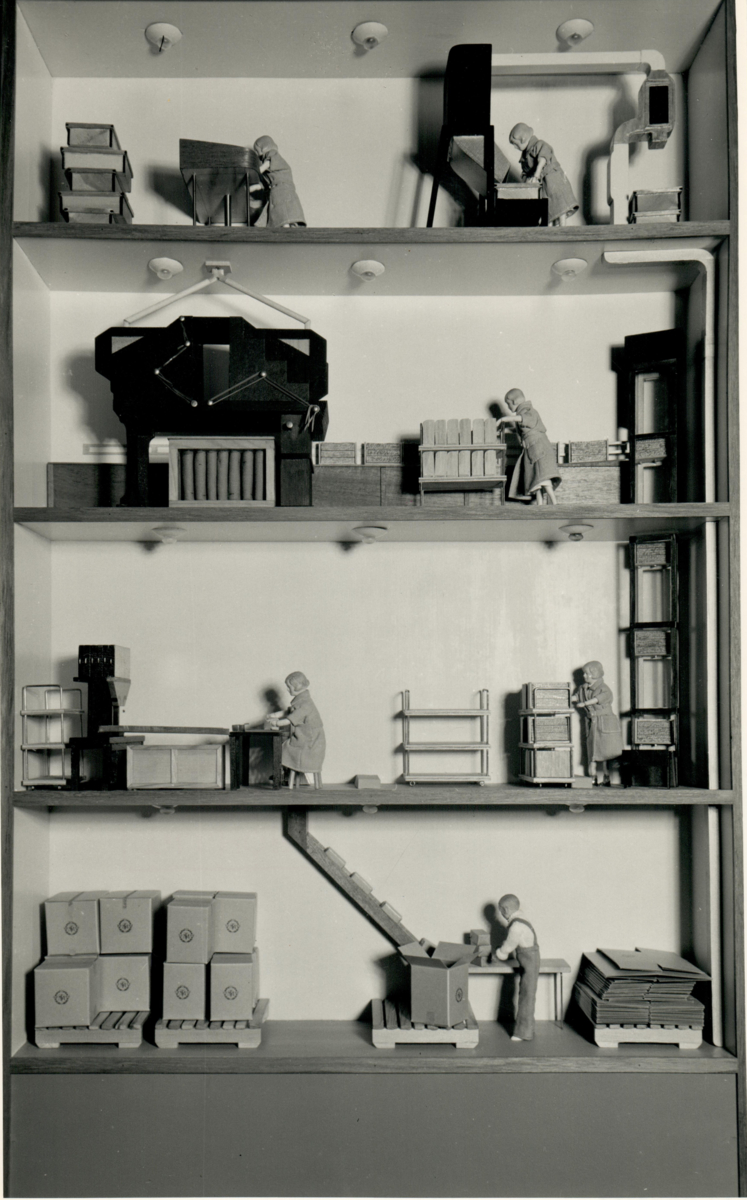 Monter med beskrivning av Svenska Tobaksmonopolets produktionsflöde.