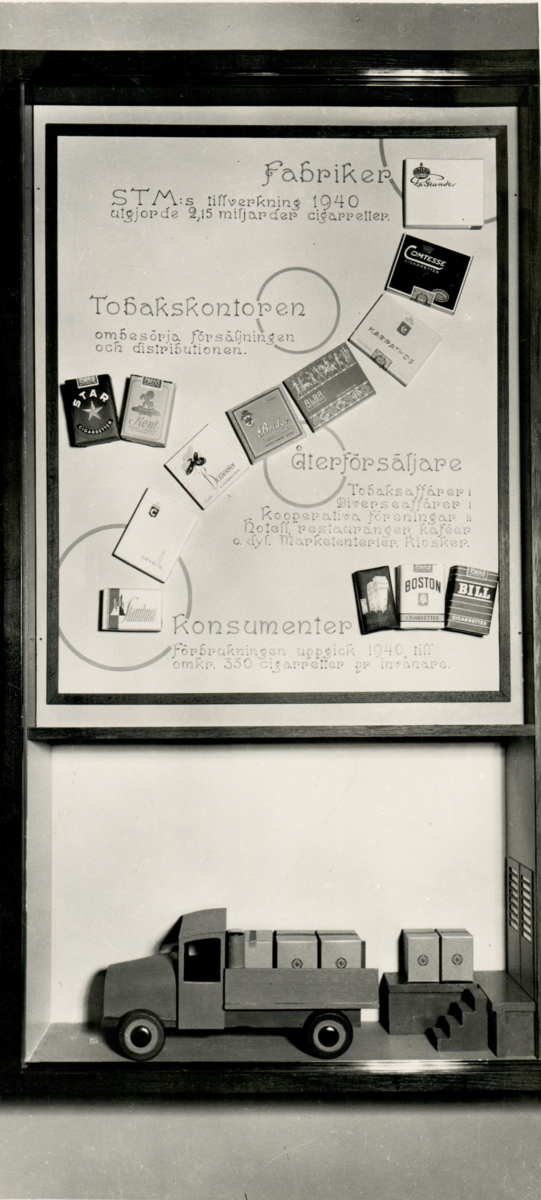 Titel: Monter med beskrivning av Svenska Tobaksmonopolets produktionsflöde.