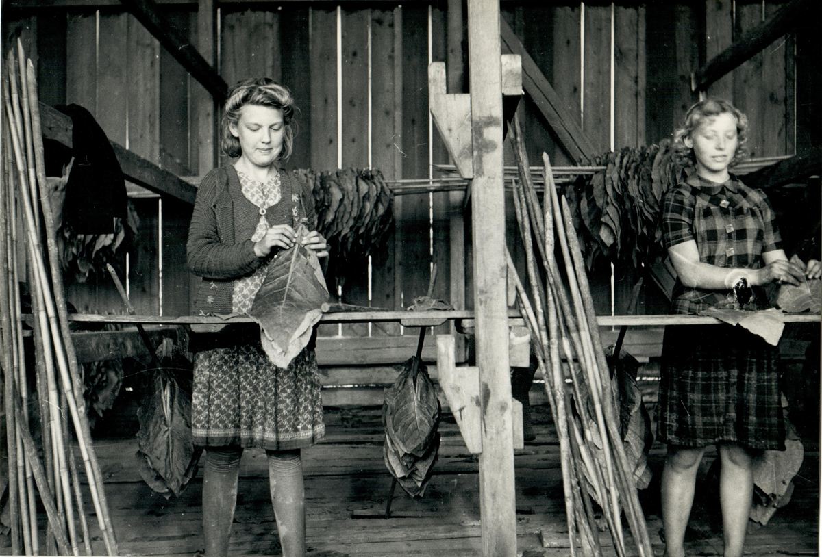 Tobaksbladen träds upp på käppar i och för upphängning till tork, från en av Norrköpings torklador.