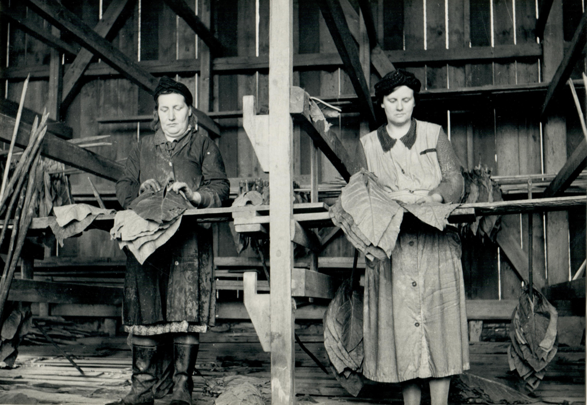 Tobaksbladen träds upp på käppar i och för upphängning till tork, från en av Norrköpings torklador.