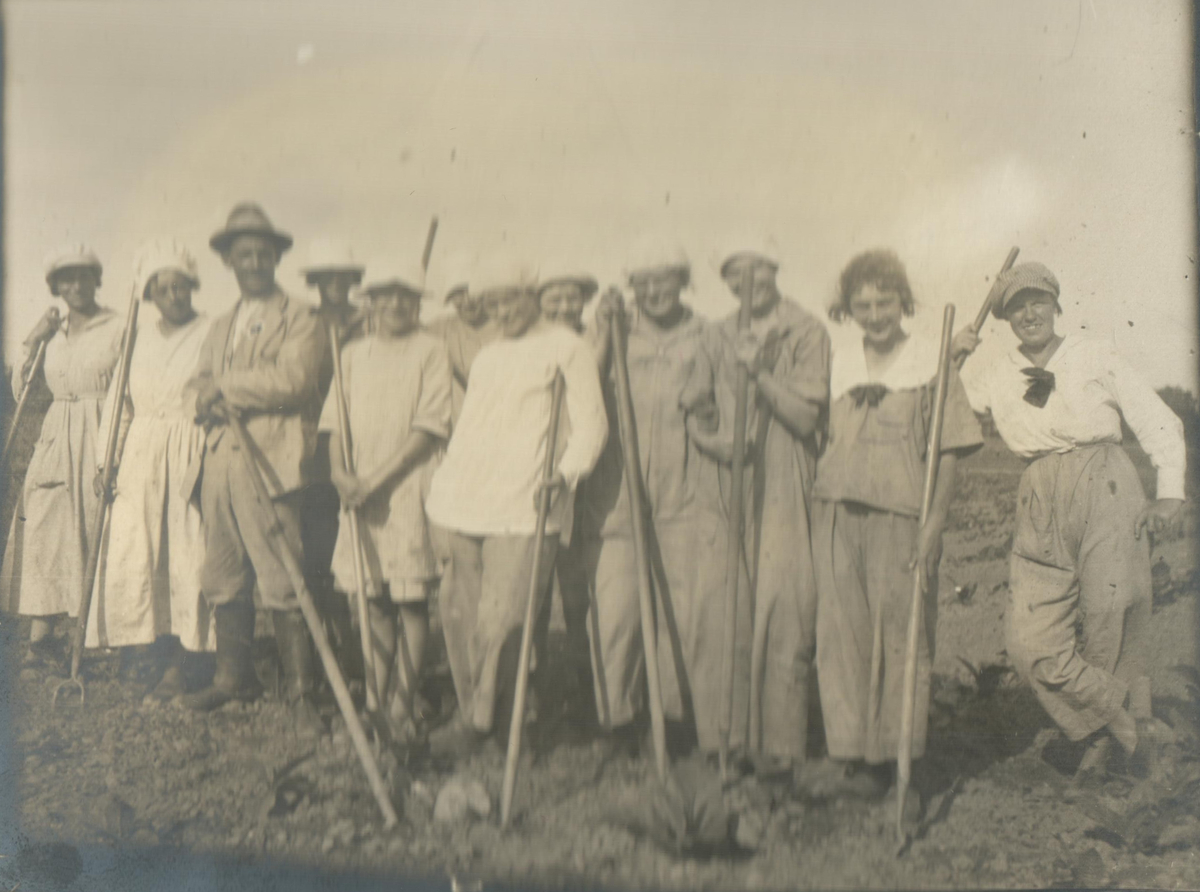 Flertalet tobaksodlare står i tobaksodlingen i Prästnibble 1920.