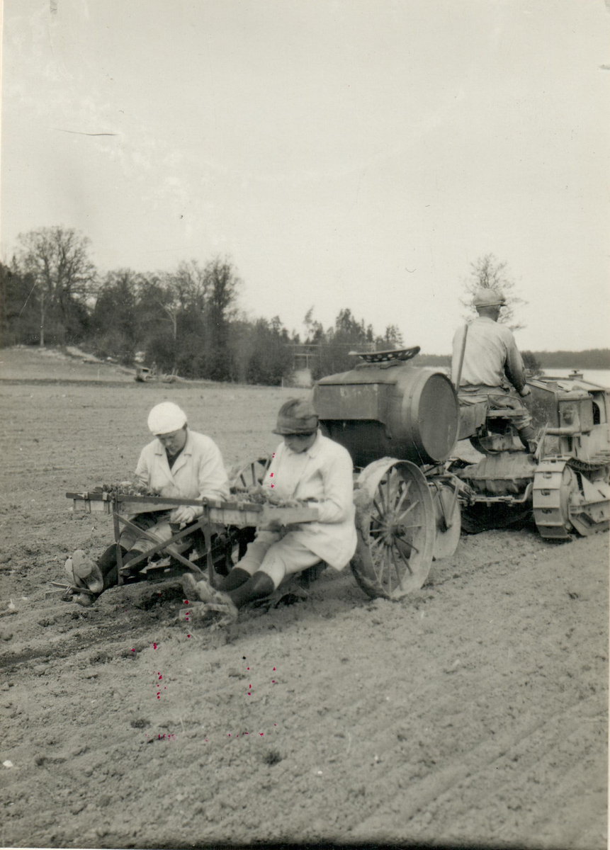 En planteringsmaskin körs på en åker. Tobaksodling i Prästnibble 1921.
